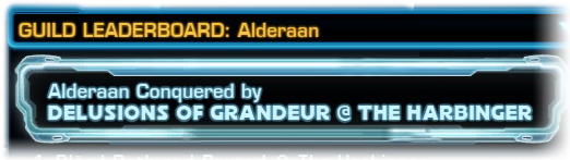 We are currently enjoying Delusions’ customary level of success in the Onslaught expansion, which is clearing new Hardmodes in Dxun, pre-nerf, just a few months behind the hardcore guilds.[/vc_column_boxed_text][/vc_column][vc_column width=”1/3″][vc_wp_text][/vc_wp_text][/vc_column][/vc_row][vc_row css=”.vc_custom_1551175768955{margin-top: -30px !important;padding-top: -30px !important;}”][vc_column][vc_separator][/vc_column][/vc_row][vc_row css=”.vc_custom_1551178250620{padding-top: 44px !important;background-image: url(http://www.wehavedelusionsofgrandeur.com/v3/wp-content/uploads/2019/02/pve-cq-back2.png?id=130) !important;background-position: 0 0 !important;background-repeat: no-repeat !important;}”][vc_column width=”1/2″][vc_column_boxed_text el_text_title=”Conquests”]We do not prioritize Galactic Conquests as a guild. Our goal with 5.10’s new “guild leveling” system was simply to hit the guild target each week, and we manage that easily. Delusions is level 65+, meaning we have all the perks available to guilds. Pursuit of planetary conqueror titles, on the other hand, is inconsistent with the intimate, non-obligatory atmosphere in Delusions.